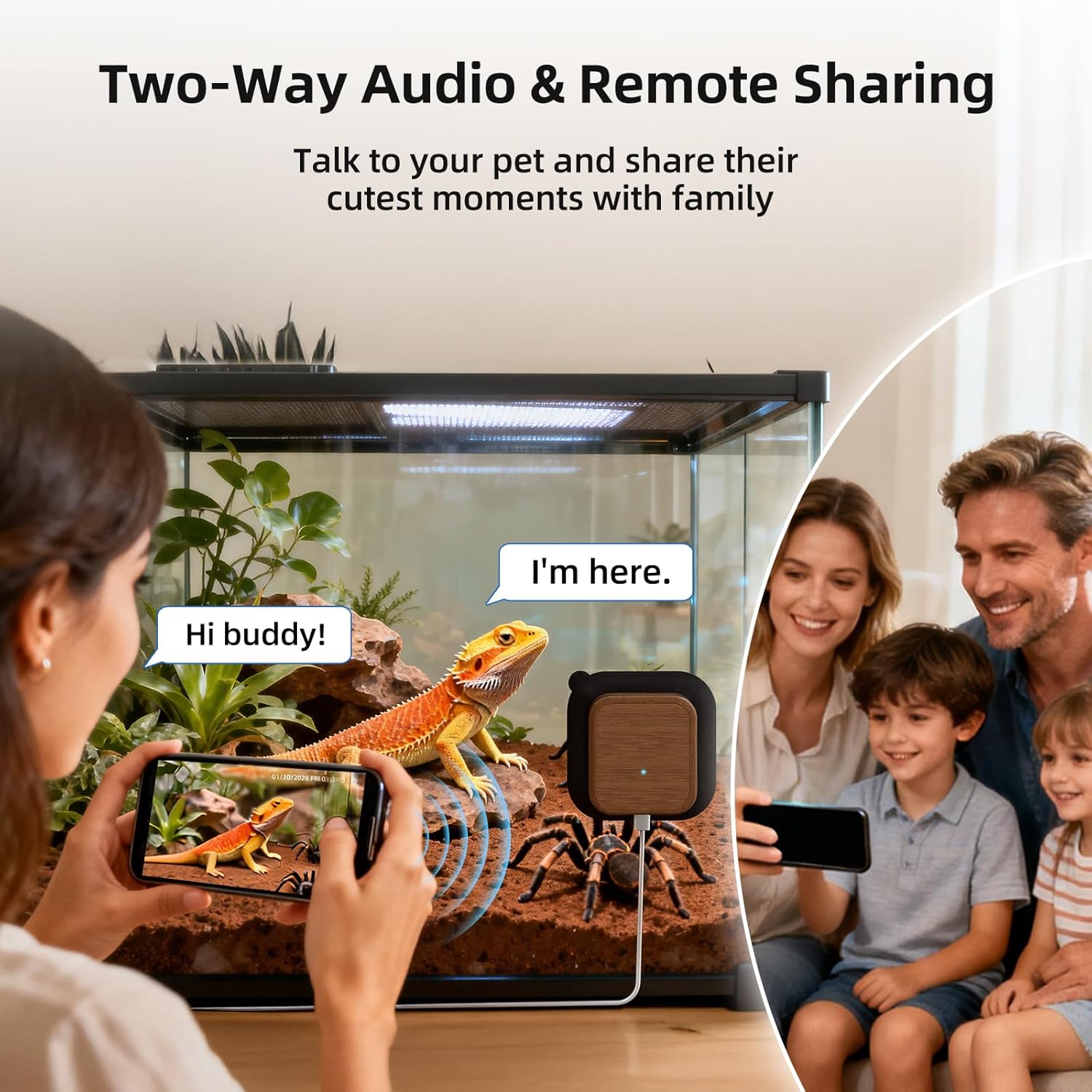 • Two-Way Audio & AI Motion Alerts: Aquarium camera lets you monitor real-time conditions inside the enclosure, clearly hear subtle interactions between your pet and its habitat, and communicate with them when needed. Pet camera also detects activity changes and sends instant alerts, helping you stay informed with ease.It’s ideal for monitoring pets while you’re away for long periods, or closely observing young animals during critical growth stages.