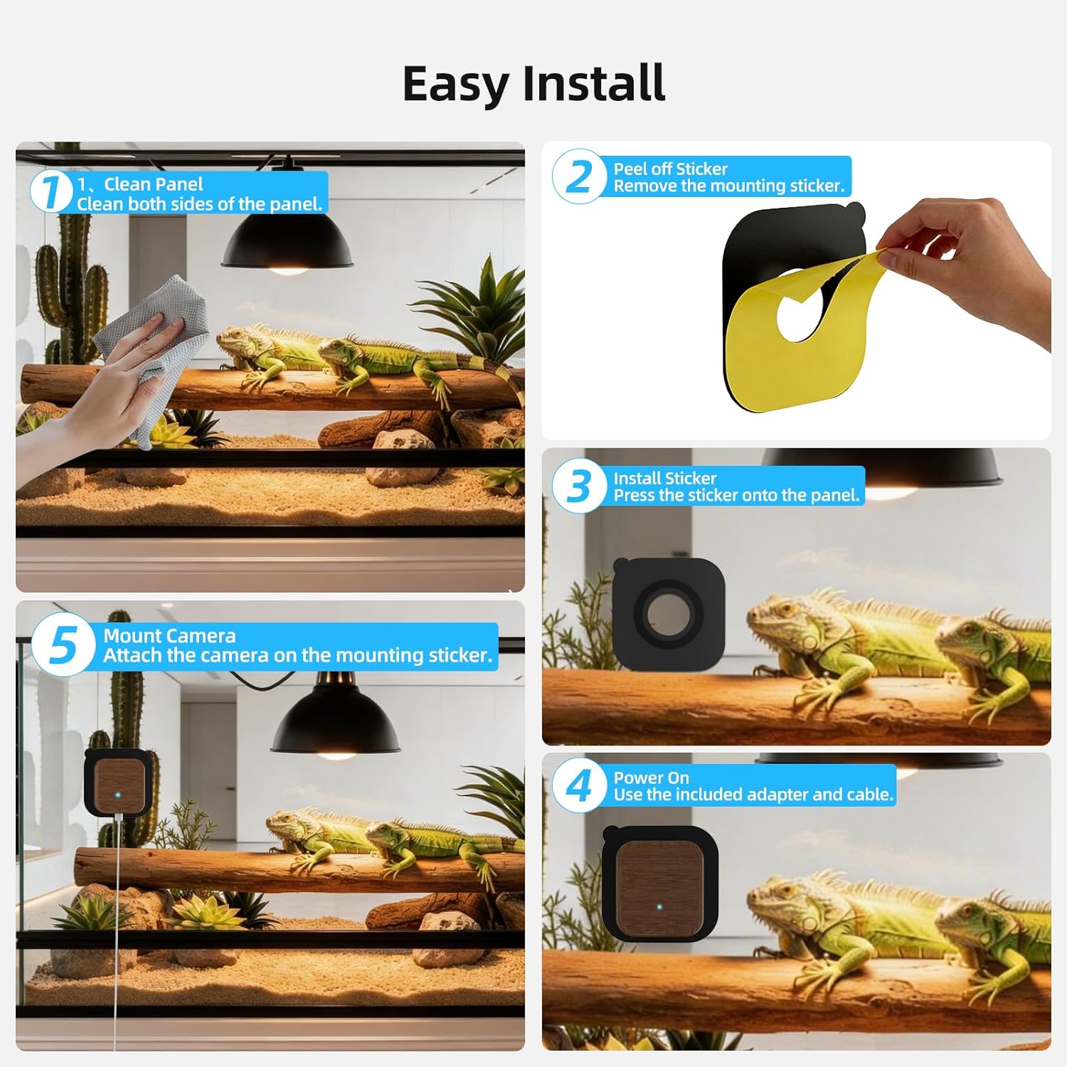 • Color Night Vision & Wide View: Many reptiles are most active at night. Terrarium camera uses advanced black-light night vision to deliver clear full-color video both day and night. Even in low-light conditions, you can still see your pet’s natural colors, movements, and details inside the terrarium. Whether your reptile is exploring at night or feeding after dark, every moment stays vivid and true to life. The 120° diagonal field of view ensures full terrarium monitoring.