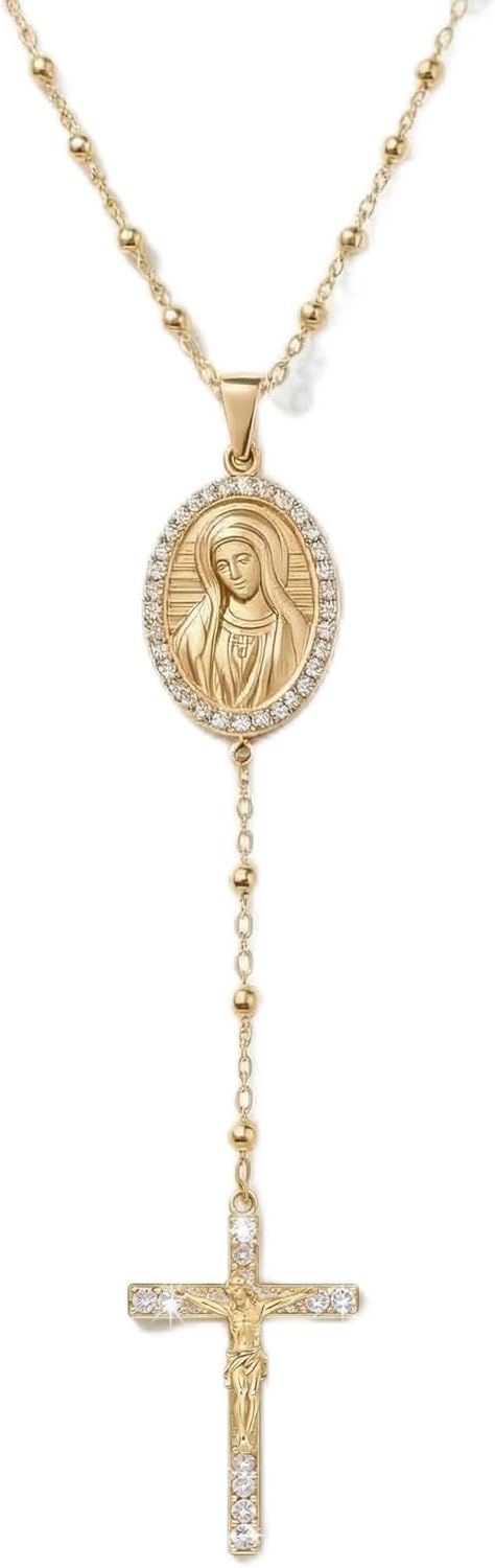 Embrace Faith & Elegance with the PinkBanni Virgin Mary NecklaceDiscover a profound expression of faith and exquisite craftsmanship with the PinkBanni Gold Plated S925 Sterling Silver Miraculous Medal Rosary Necklace. This stunning piece serves as a beautiful virgin mary necklace, symbolizing divine grace and protection. The central Oval Virgin Mary pendant with halo design is delicately adorned with brilliant Cubic Zirconia, reflecting the radiant presence of the Blessed Mother. Below, a striking ruby gemstone cross pendant adds a touch of vibrant color and profound meaning, representing devotion and sacrifice. This unique Y-drop rosary style necklace beautifully combines traditional reverence with contemporary elegance, making it a perfect everyday Christian necklace or a significant piece for religious occasions.Crafted from premium S925 sterling silver and meticulously gold plated, our mary necklace for women is designed for lasting beauty and comfort. It is naturally hypoallergenic, nickel-free, and lead-free, ensuring it is gentle on even the most sensitive skin. The advanced plating technology ensures it is non-tarnish everyday wear and water-resistant, allowing you to cherish this devotional jewelry women piece without worry. To maintain its lustrous shine, avoid direct contact with harsh chemicals, perfumes, or lotions. Simply wipe gently with the provided soft cloth after wear to keep your gold mother mary necklace gleaming.This exquisite Gold Beaded Chain Necklace Virgin Mary with its Miraculous Medal with Ruby and ruby gemstone cross pendant makes an exceptionally thoughtful and meaningful gift. It is an ideal Catholic gift for mom, a cherished First Communion gift for girls, or a memorable Confirmation gift for teen girl gold. Perfect for