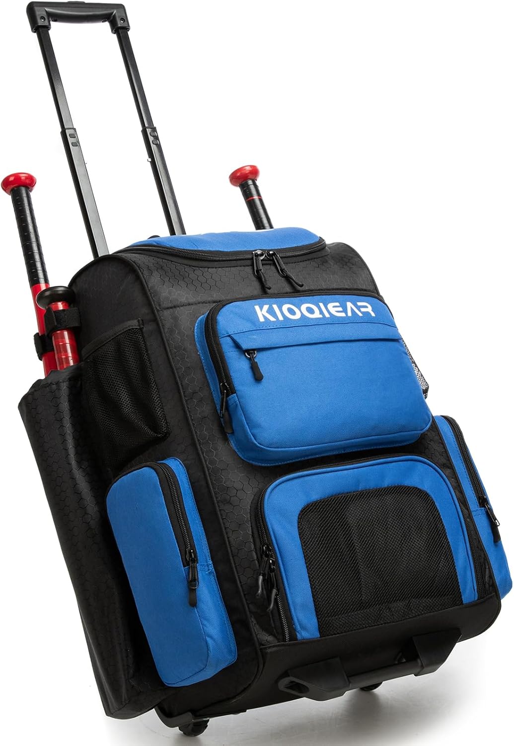 Product Description: Kioqiear Rolling Baseball Bag with WheelsEngineered for the player who values streamlined efficiency and robust transport. This high-performance catcher’s bag eliminates the struggle of carrying heavy gear, featuring a professional telescopic handle and smooth-rolling wheel system that glides effortlessly across parking lots, fields, and dugouts. Your journey from car to diamond has never been simpler.Step up to elite-level organization. The intelligently designed interior provides systematic storage for your entire arsenal: shoes,leg guards, chest protector, helmet, gloves, and accessories each have a dedicated space. Exterior reinforced bat sleeves securely hold up to four bats, ensuring your key tools are protected and within immediate reach.Built to withstand the relentless pace of season after season. Constructed from rugged materials, it stands up to dirt, mud, and the demands of travel. The separate ventilated shoe compartment effectively manages moisture and odor, keeping your cleats isolated and the rest of your gear fresh.From weekend tournaments to daily practices, this is the definitive wheeled solution for the serious athlete, this gear hauler delivers the high-capacity storage, durable construction, and effortless roll-on mobility that serious performance requires.