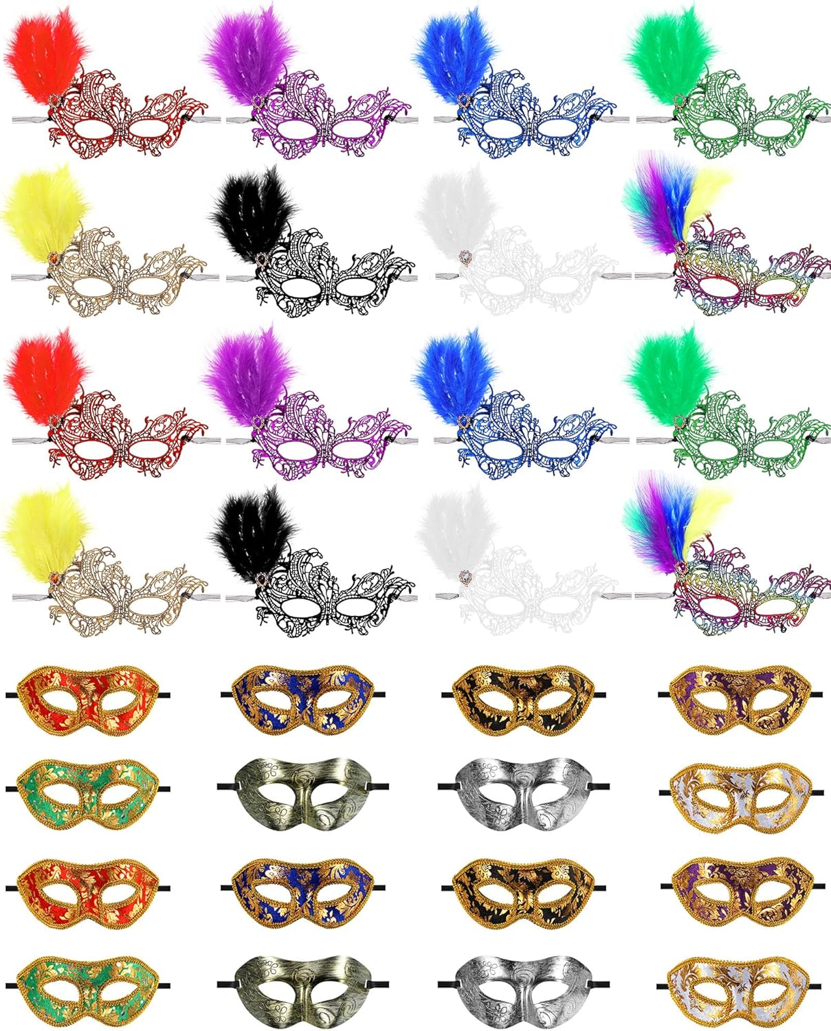 Features: Our masks for masquerade party for women serve as exquisite gifts for your family, friends, colleagues, and other important people in your life. The joy they will experience while receiving such a beautiful gift is immeasurable. Participation in masquerade events wearing these masks can provide a memorable shared experience that fosters closer relationships. These men's masquerade masks come in a variety of colors and sufficient quantity, so you can choose according to your clothes. Whether you wear a dress or a skirt, they will fit into your outfit and add appeal and charm to you. Specifications: Material: Men mask: PVC Size: approx. 7.9 inches in width Package includes: Masquerade masks for women Venetian masks Notes: Manual measurement, please allow slight errors in size. The color may exist a slight difference due to different screen displays