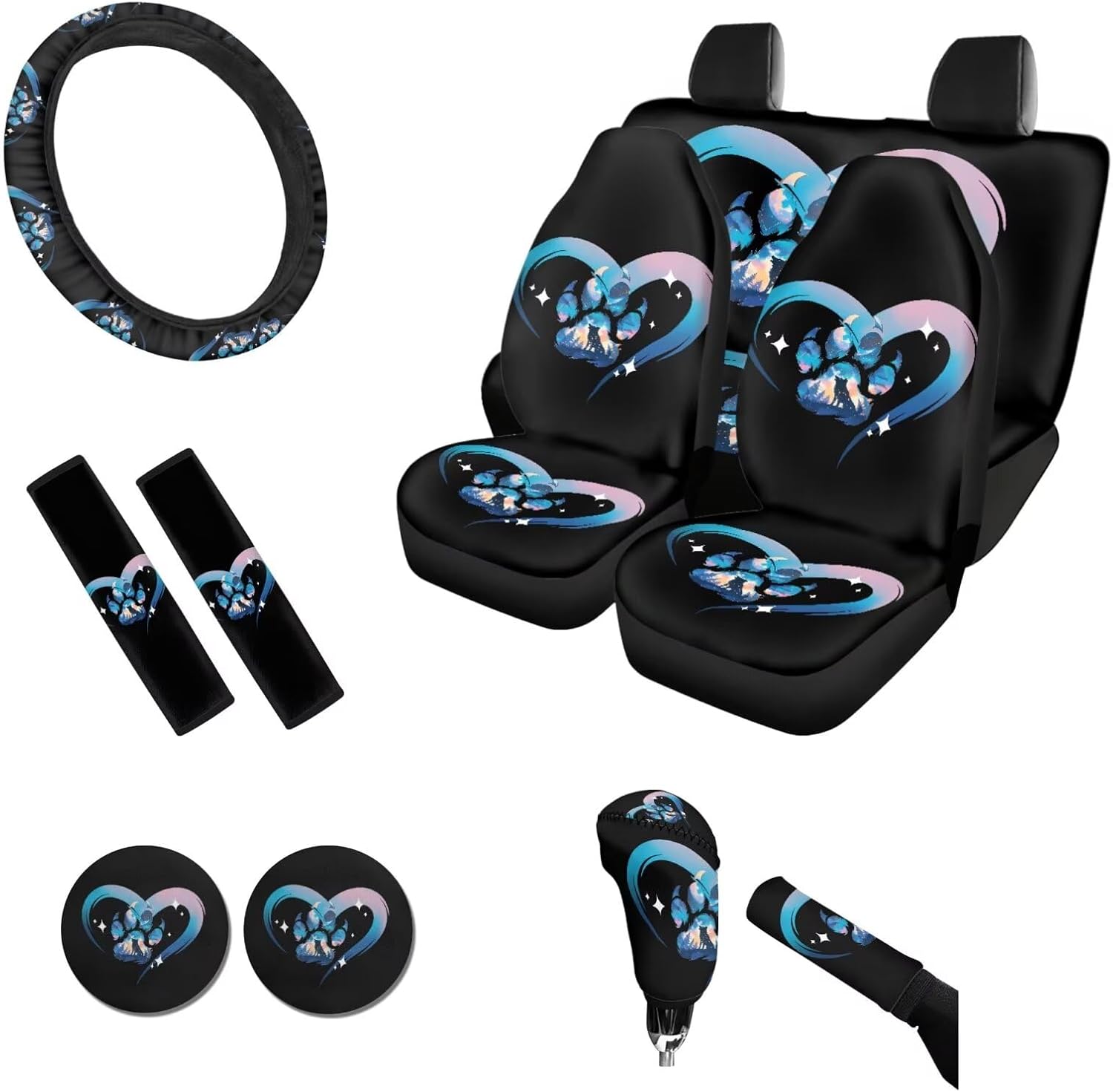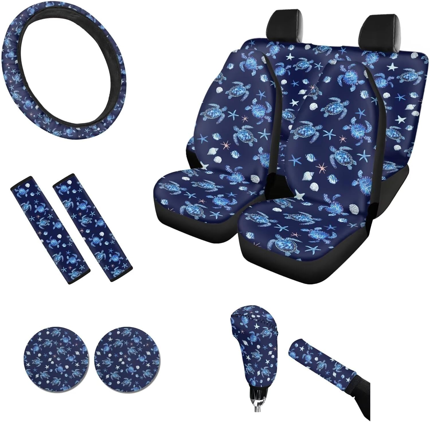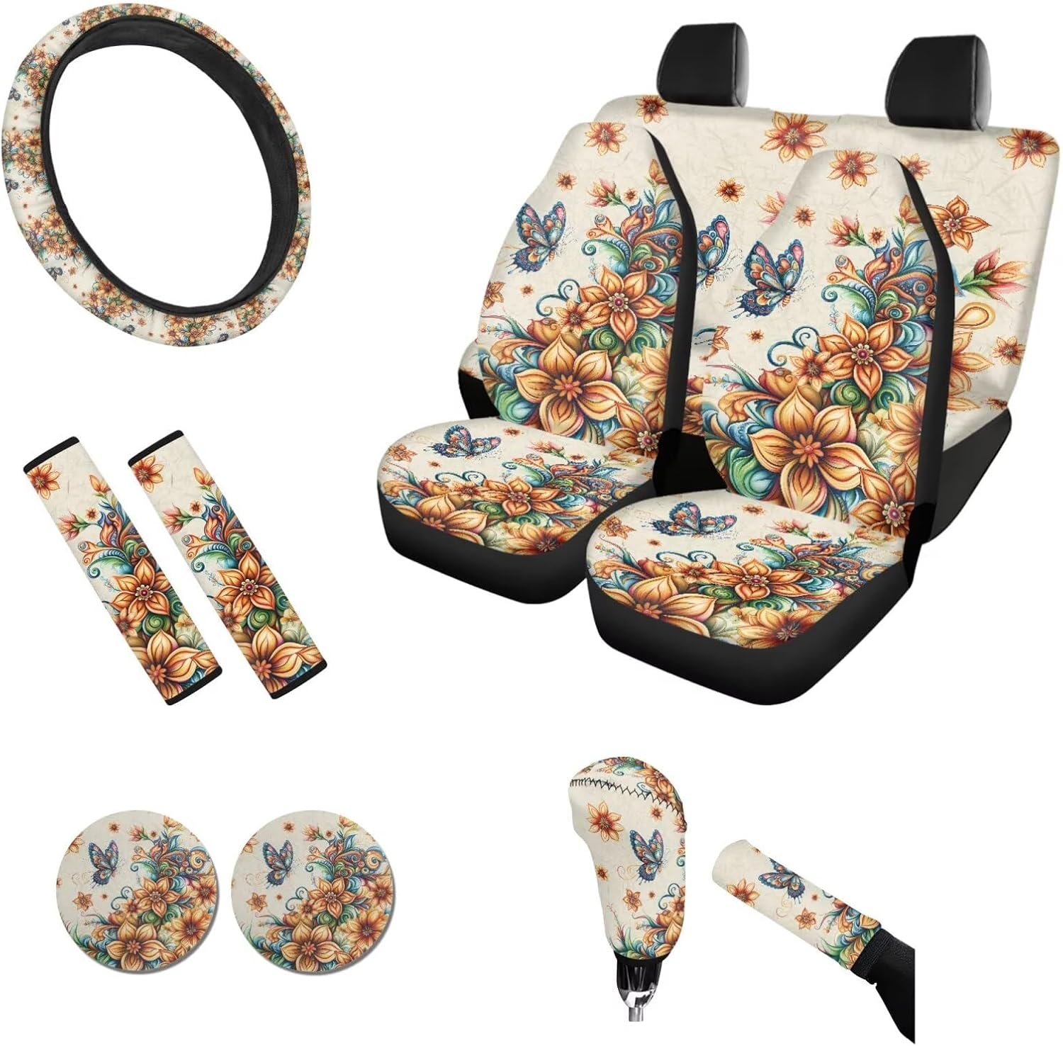 About Tomeusey Car Seat Cover Full Set 11 Pcs 🔸Made of comfortable and durable polyester material, it is elastic and can effectively protect the original car seat, reducing damage to the original car seats. 🔸Our seat covers set are easy to install and the cushion comes with elastic straps for easy installation and disassembly, aiming to protect your car seat from damage. 🔸The full set of seat covers is designed with 3D printing and fashionable and diverse theme patterns, making it the preferred decorative accessory for your car. 🔸The car seat cover set is fast to install, easy to disassemble, easy to clean, and dry. 🎁This is also a great Thanksgiving, Christmas, New Year, or birthday gift to give to your friends, colleagues, and family. 🔸Package includes: 4 x Car Seat Covers Set (2 front seat covers + 1 rear backrest cover + 1 rear bottom bench cover) 1 x Steering Wheel Cover 2 x Auto Seat Belt Cover 2 x PU Car Coaster 1 x Gear Lever Cover 1 x Hand Brake Cover 🔸【Washing Method】 It can be hand-washed & machine washable, do not soak for a long time. 🔸【Note】 Please kindly measure your car seats before purchase! Please contact us if you have any questions about the use of our product. 💡About Tomeusey Brand We are a company integrating production and sales. we provide a variety of color style products for you to choose, we are committed to bringing customers a new experience, and maximizing the experience of your life!